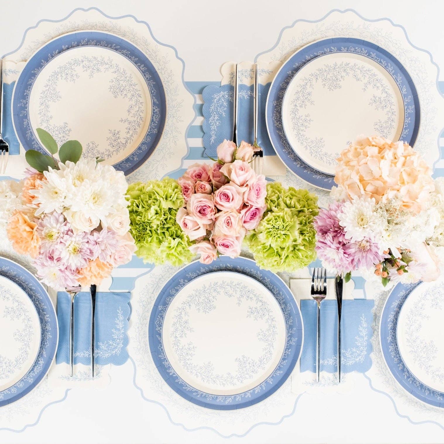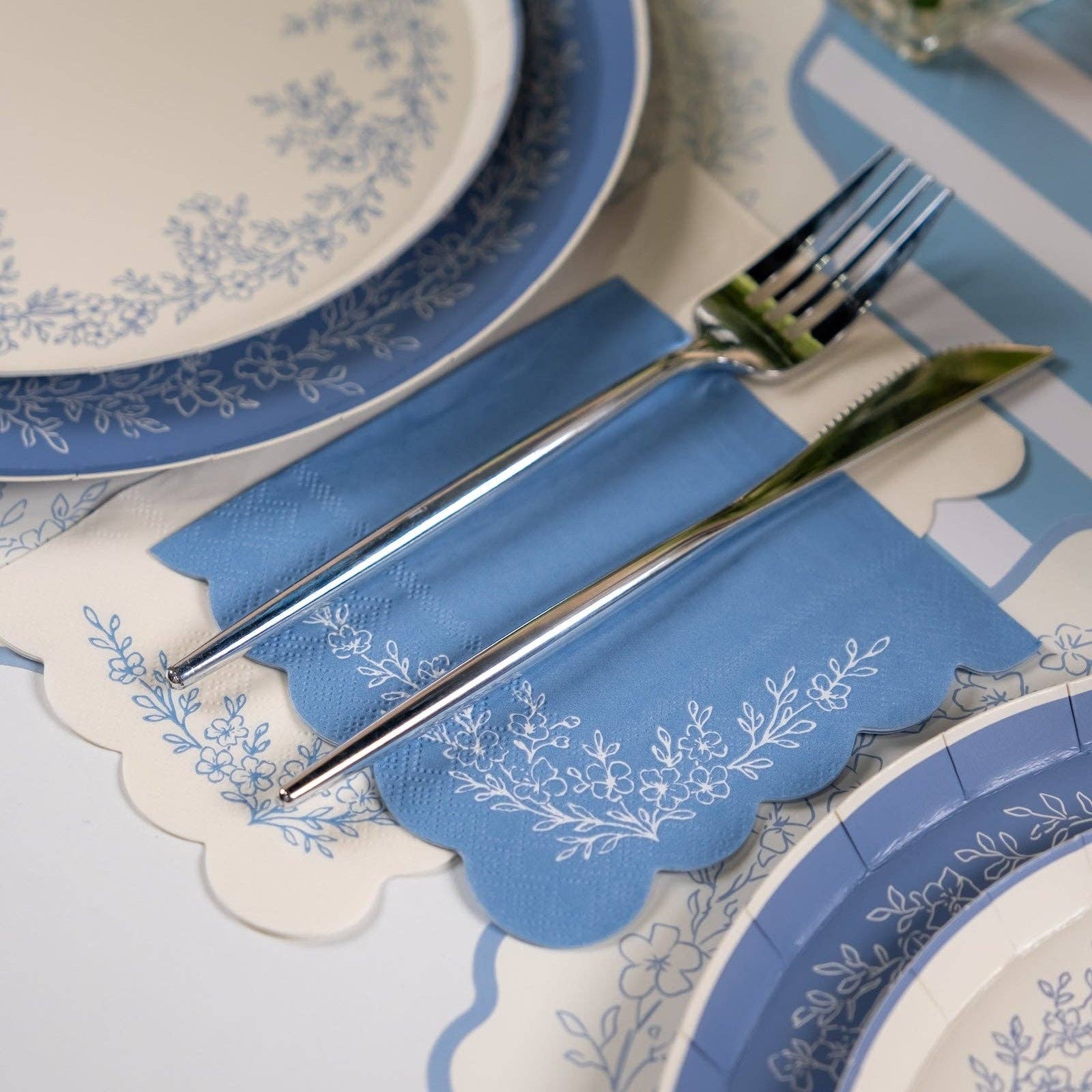 Elevate your spring tablescape with our softly scalloped cocktail napkins finished with an intricate corner bouquet, petite blossoms and leafy sprigs rendered in fine ivory line-work. The artwork nods to vintage china yet feels fresh and airy, with delicate negative space that looks refined up close and romantic from across the table. Available in three coordinating hues blush pink, light blue, and sage, each color sets a gentle pastel backdrop that lets the botanical illustration shine. Size: 5” - Pack of 16.