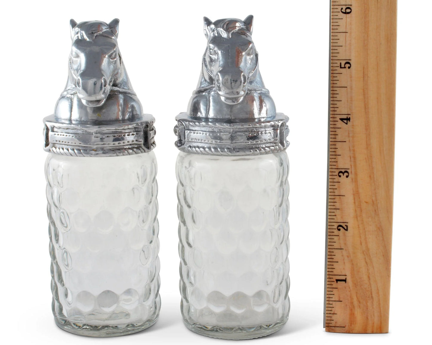 Apply a regal accent to your table with the help of Arthur Court's Salt and Pepper Set. Beautifully crafted stallions rest above the dispensers as defined bridles and manes add realistic detail. The handmade, aluminum statuettes shine brilliantly against the bumpy texture of the glass.
