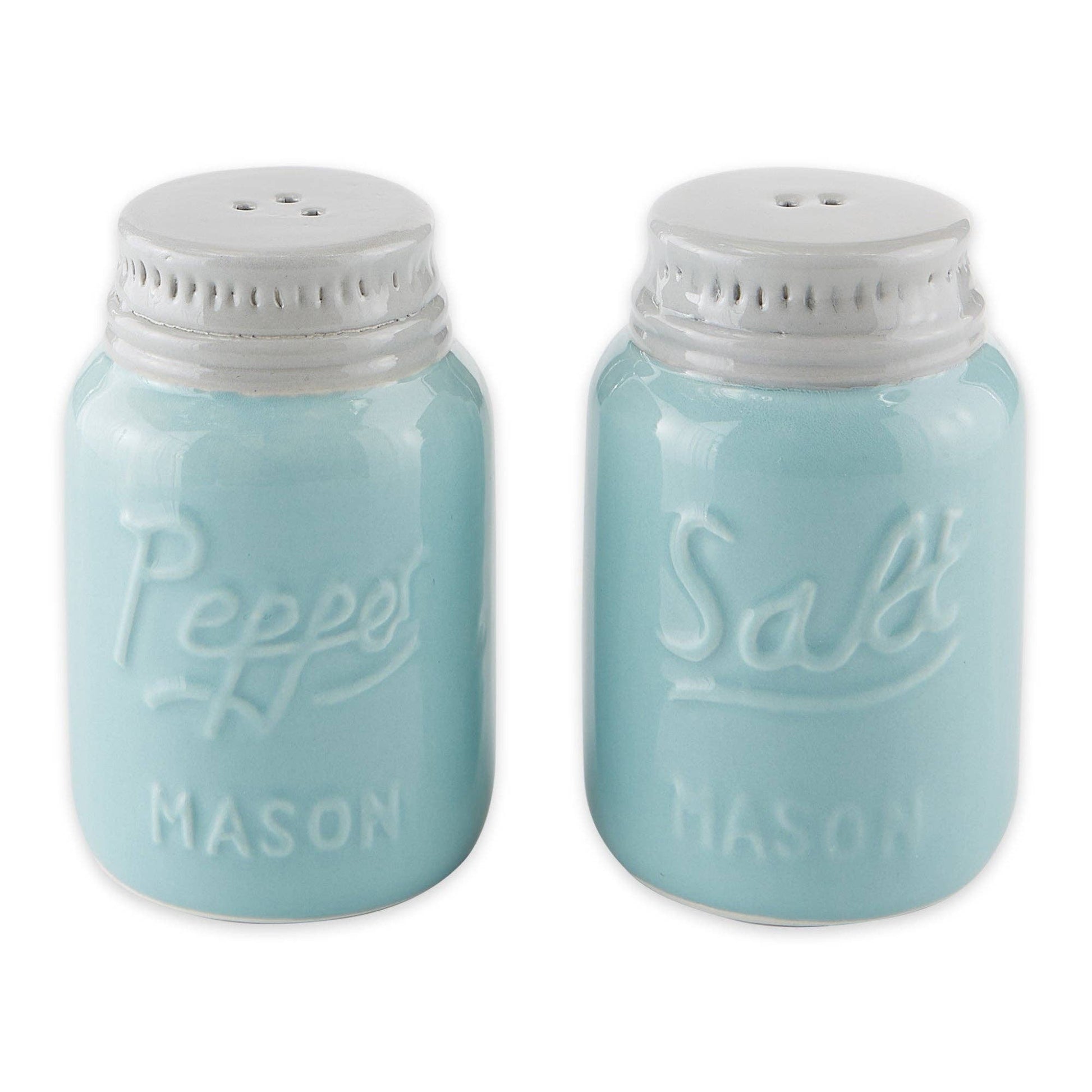 Hand painted ceramic salt and pepper set. Lovely duck egg blue Mason jar with silver tops. Embossed with "Pepper" and "Salt" with the MASON name.
