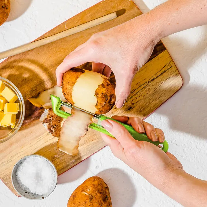 Sharple is a peeler that automatically sharpens itself every time its cover is opened or closed. Unique safety cover has a built-in ceramic ball sharpener that automatically sharpens and hones the blade every time the protective case is opened or closed. Razor-sharp Japanese stainless steel blade is designed to last a lifetime, swivels to minimize waste, and will never rust in the dishwasher. Clever handle profile provides maximum control for both left and right-handed users, and features generous drainage channels to ensure ease of cleaning and drying. Handle tip includes a convenient and highly effective potato eye and blemish remover.