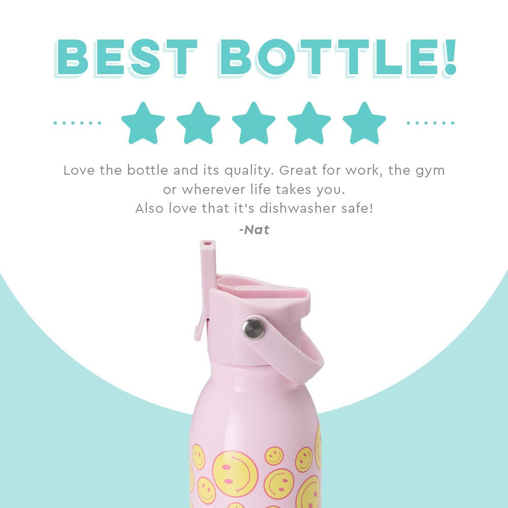 Have a cup of pick-me-up with this quirky collection of yellow smileys on a pale pink background. The Flip & Sip Cap is a game changer, drink on the go with the help of the easy carry handle and inner straw!
