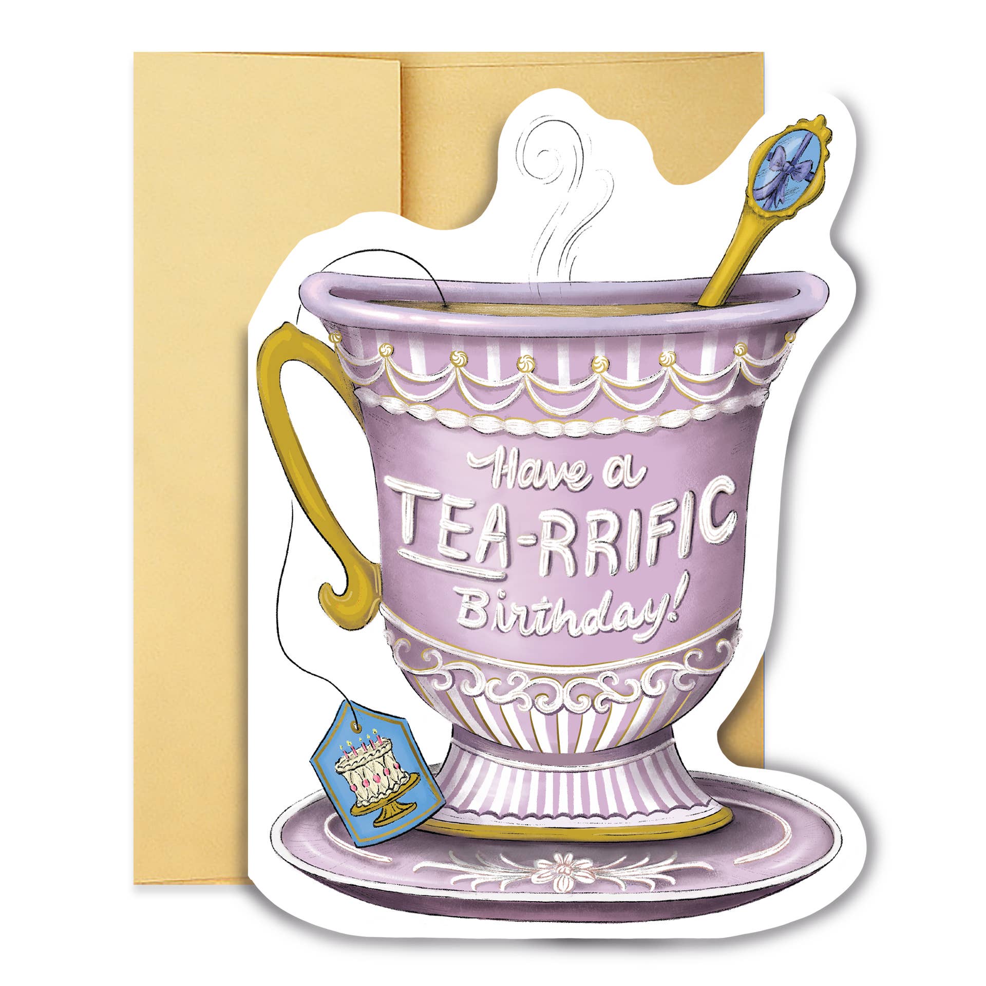 A birthday card that’s as delightful as cake and tea combined. This die-cut teacup design features ornamental linework inspired by piped frosting, with hand-illustrated lettering that reads “have a tea-rrific birthday.” Rendered in lilac, white, and gold for a playful yet polished feel.