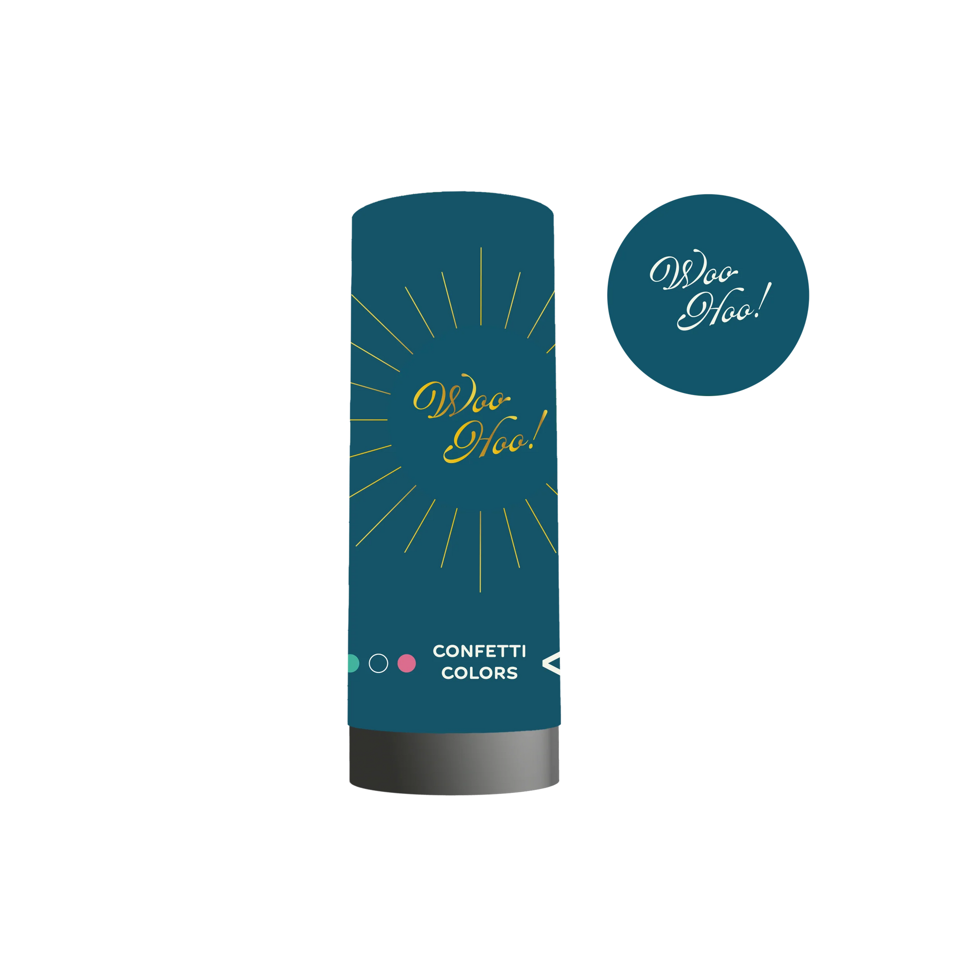 Gold foil inscription that reads "Woo hoo!" and pink, navy, and green biodegradable confetti.